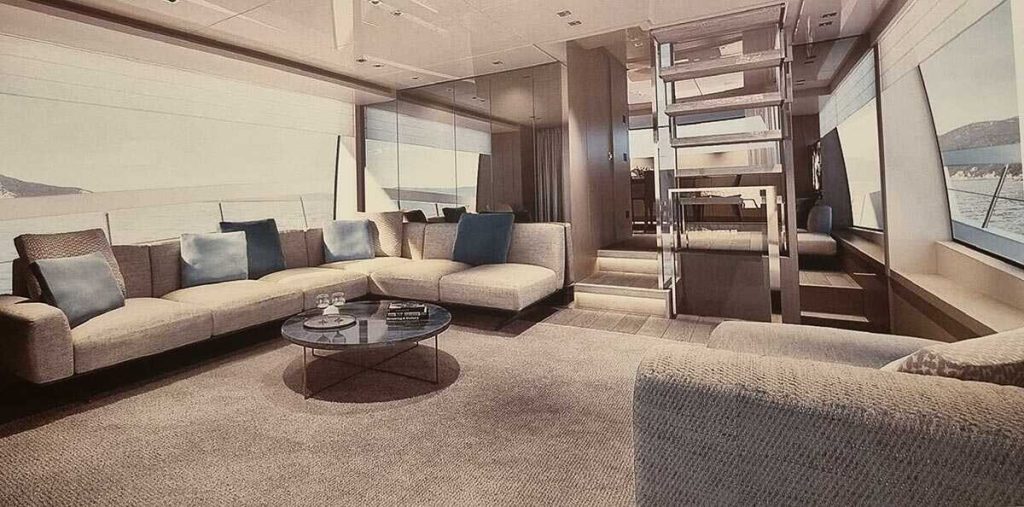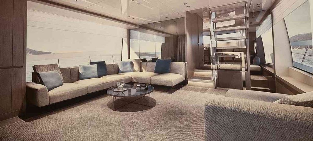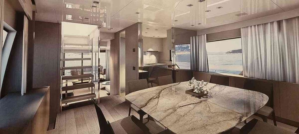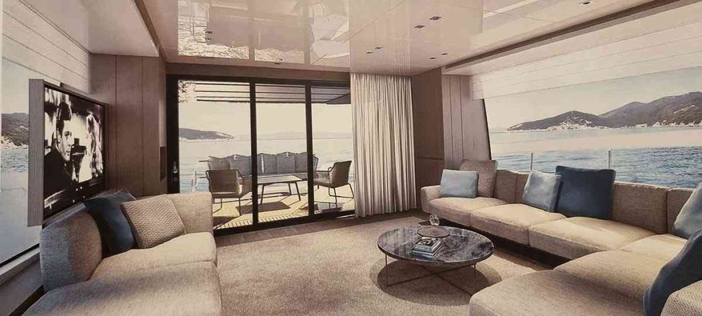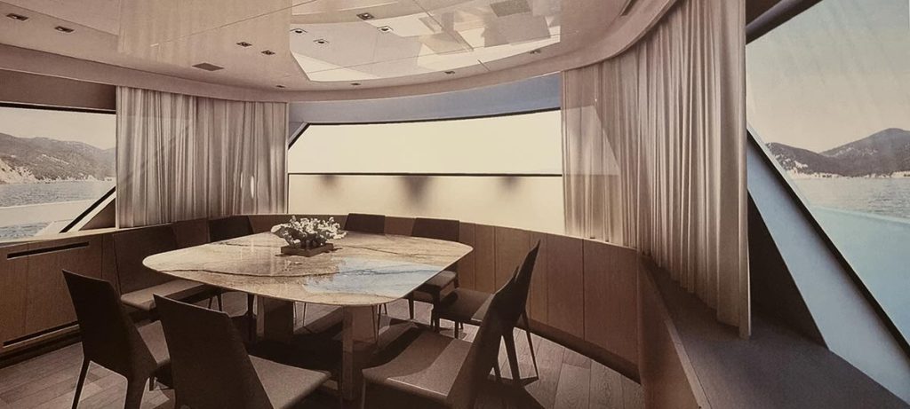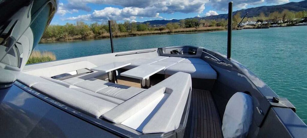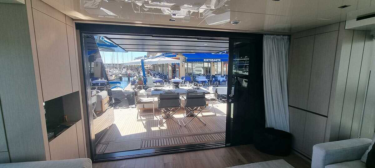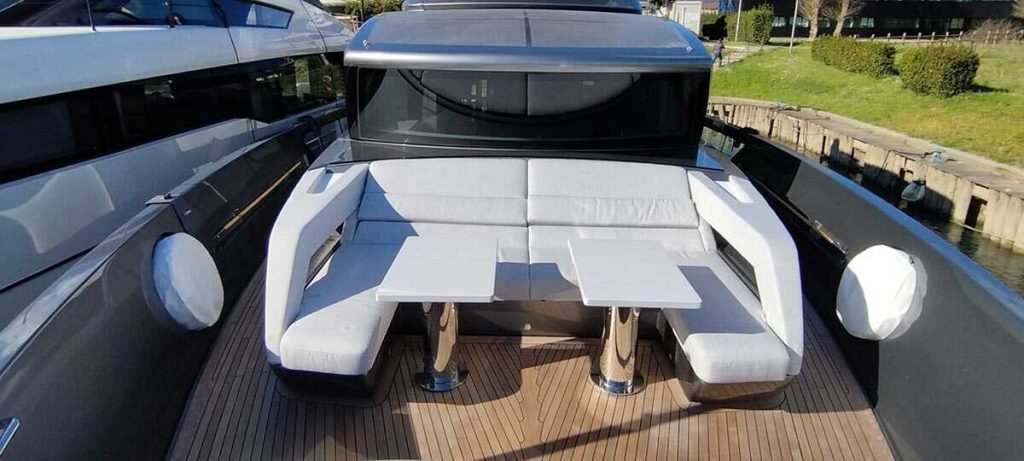 - Area Living Coperta: Zona attrezzata con tavolo, lavabo, frigorifero e ice-maker, pensata per il massimo comfort durante la navigazione o il relax.